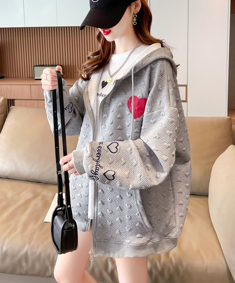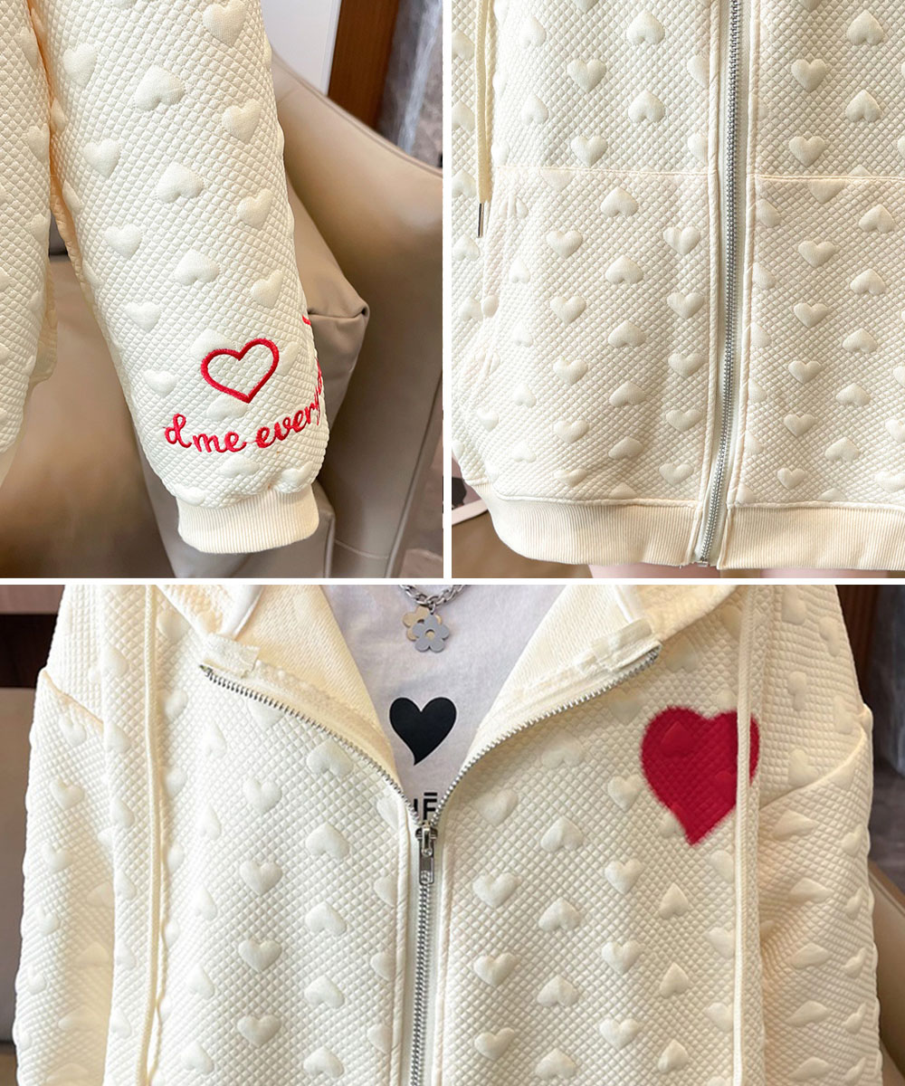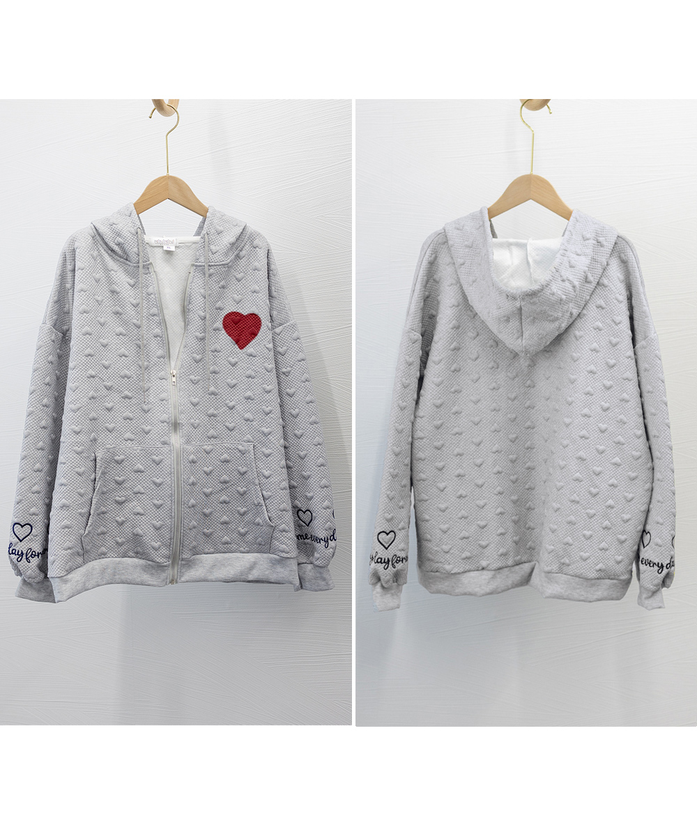 胸元の赤いハートと袖の刺繍がポイントのジップアップパーカー