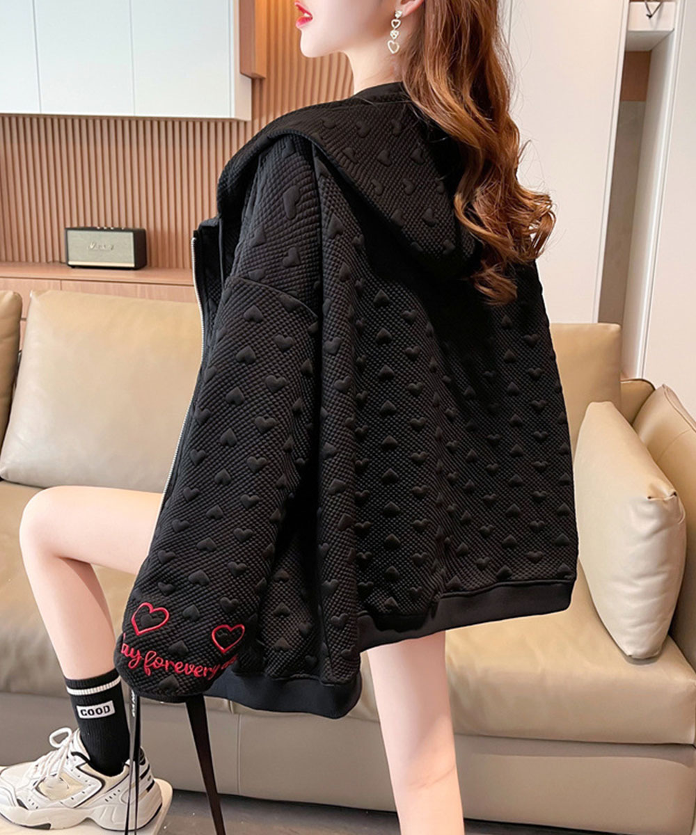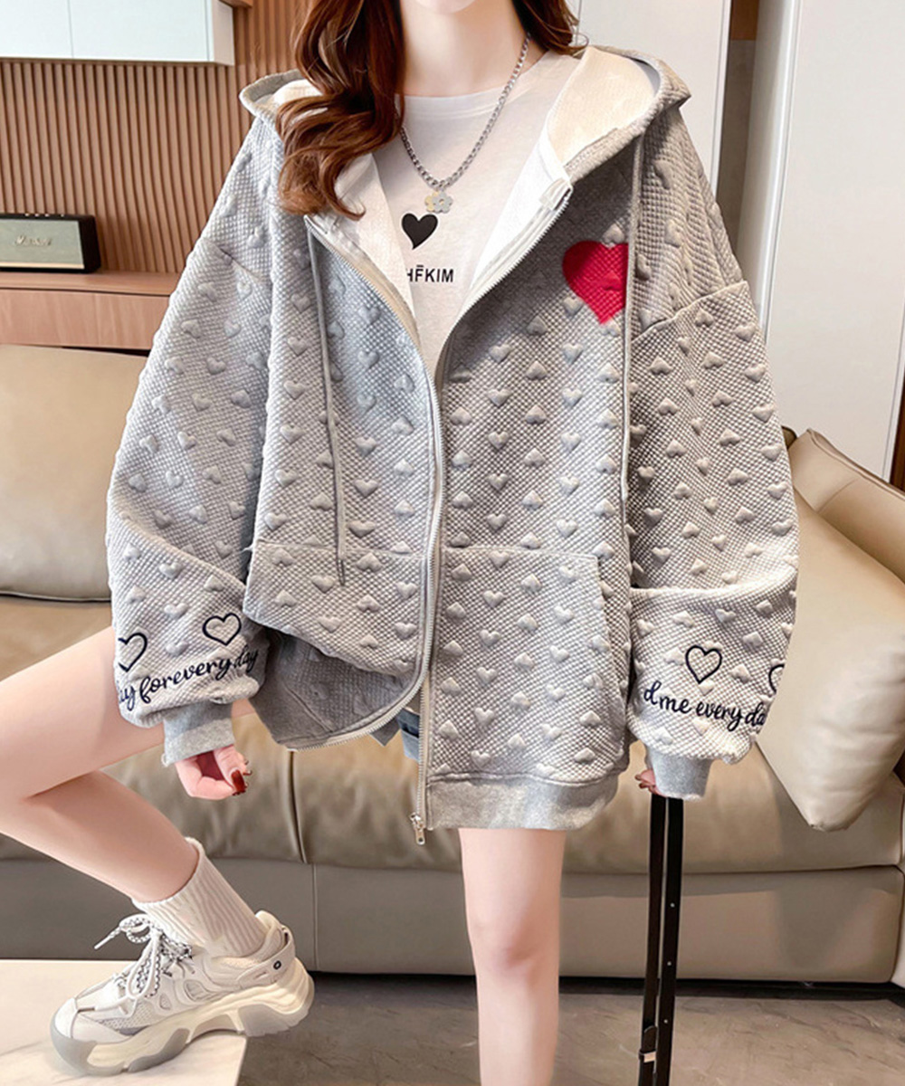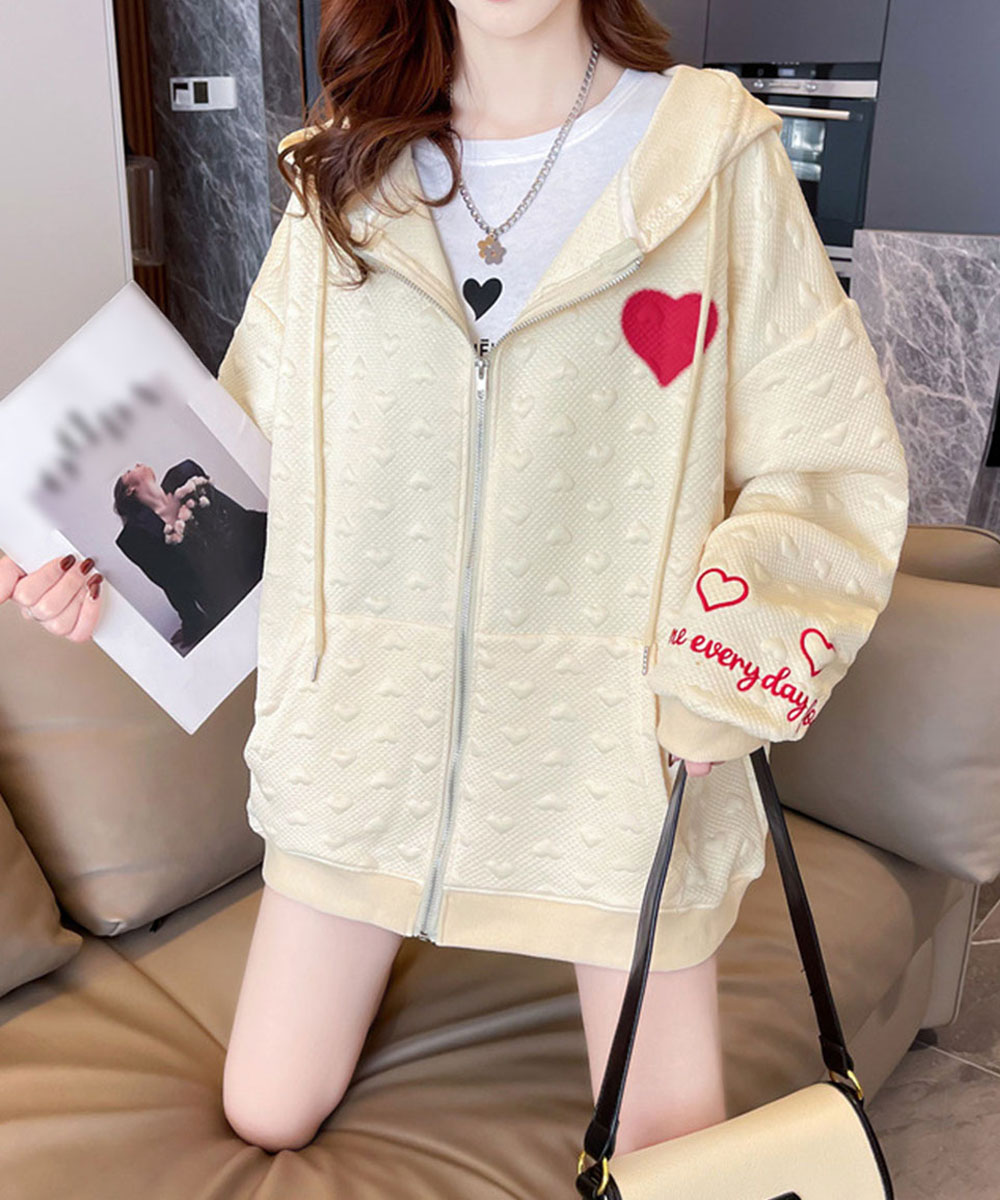 胸元の赤いハートと袖の刺繍がポイントのジップアップパーカー